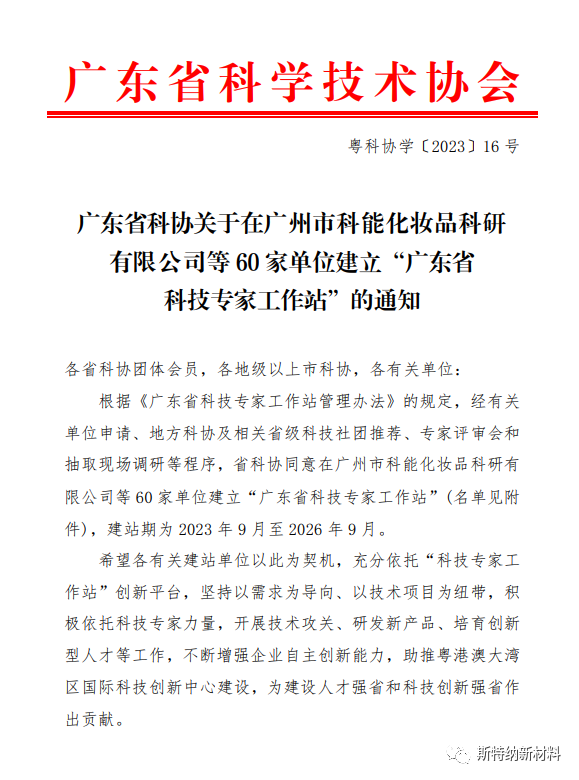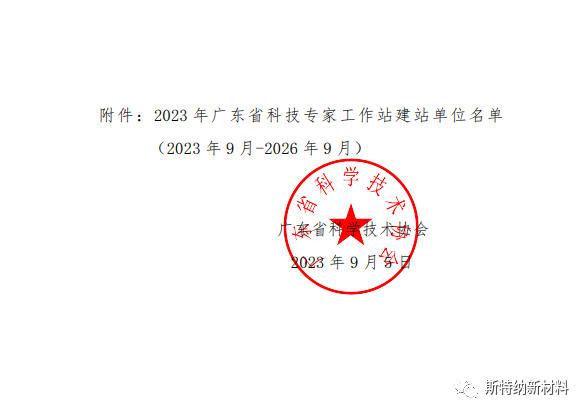 2023年9月,经市、省科协逐级推荐、省专家严格评审同意广东斯特纳新材料有限公司建立“广东省科技专家工作站”,建站期为 2023 年 9 月至 2026 年 9 月。